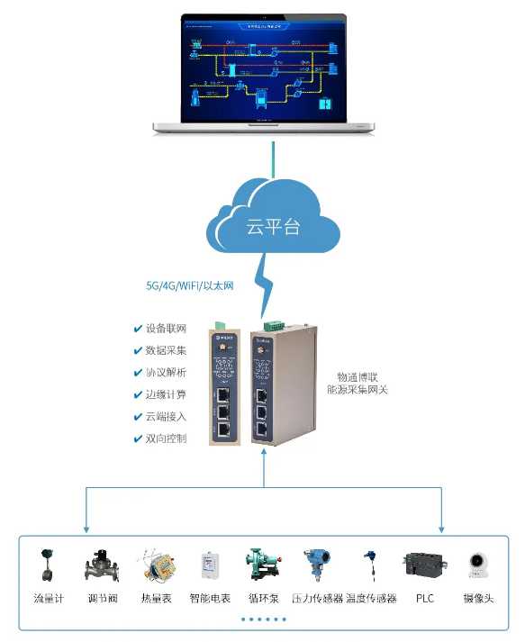通過部署能源數(shù)采網(wǎng)關,能夠?qū)崟r采集流量計、智能電表、熱量表、稱重儀器、循環(huán)泵、調(diào)節(jié)閥、溫度傳感器、壓力傳感器等設備,將供熱量、耗汽量、耗水量、耗電量、燃料消耗量、余熱利用量、溫度、壓力等數(shù)據(jù)對接到智慧供熱能源管理平臺中,從而將熱源、管網(wǎng)、中繼泵站、熱力站等納入統(tǒng)一的節(jié)能評價系統(tǒng)中,實現(xiàn)對能源的監(jiān)測、管理、統(tǒng)計與分析,助力提高能源利用效率與管理水平,實現(xiàn)節(jié)能、降本與增效的全面發(fā)展。