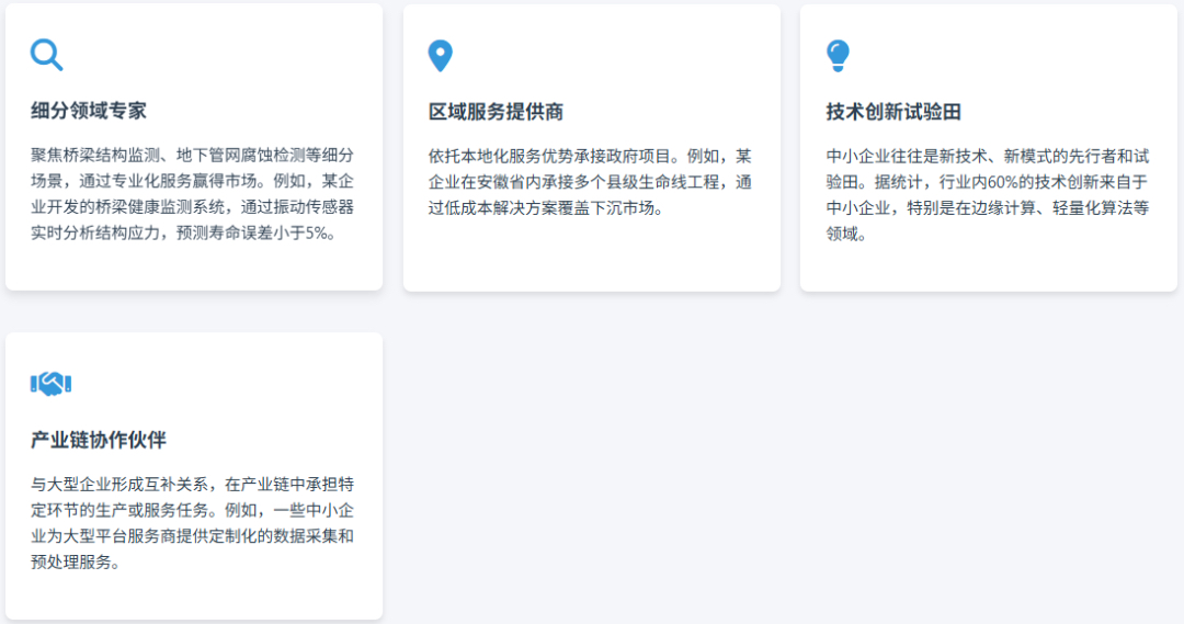1.        聚焦橋梁應力監測、地下管網腐蝕檢測等細分場景,如某企業研發的橋梁應力監測系統,壽命預測誤差<5%,形成技術壁壘;依托本地化服務優勢,拓展縣域及下沉市場(如安徽縣域生命線項目,單項目造價控制在 500 萬元內,適配地方預算)。