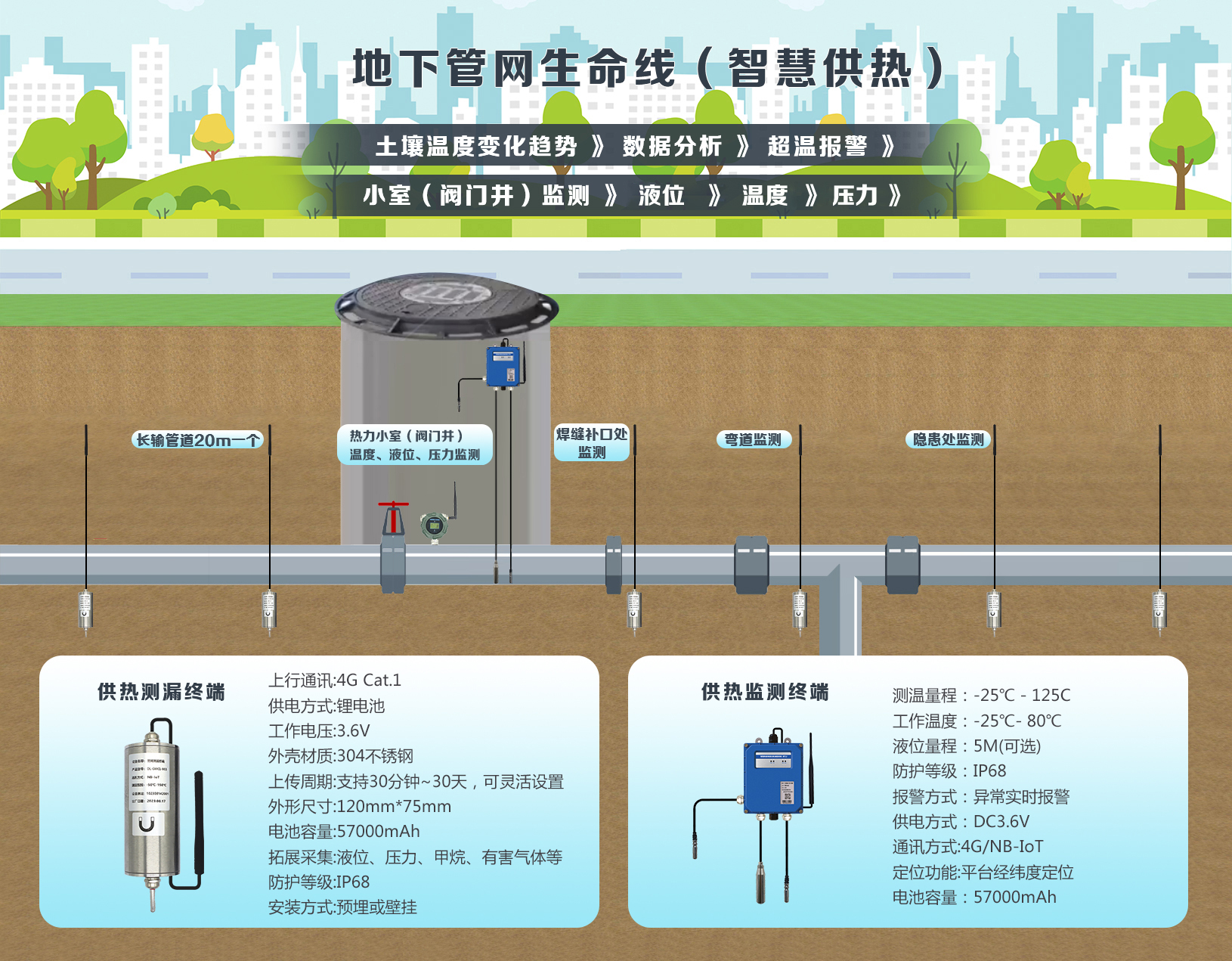 1、燃氣、供水、排水、熱力、橋梁、綜合管廊等監測:通過實時監測這些基礎設施的關鍵指標,如壓力、流量、液位、流速、水質等,可以及時發現和解決問題,確保城市基礎設施的正常運行。